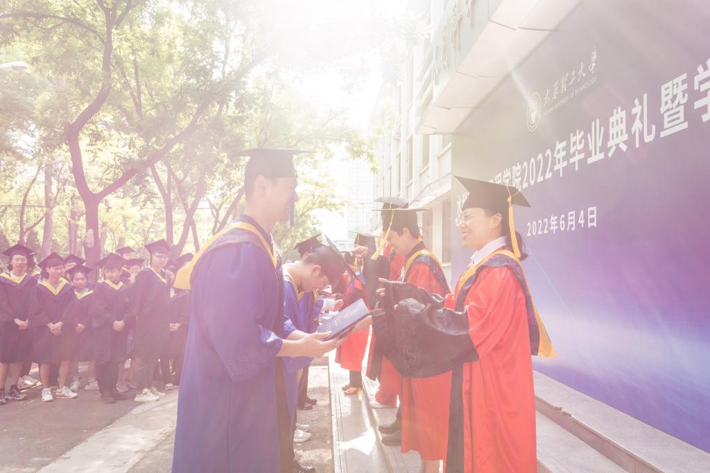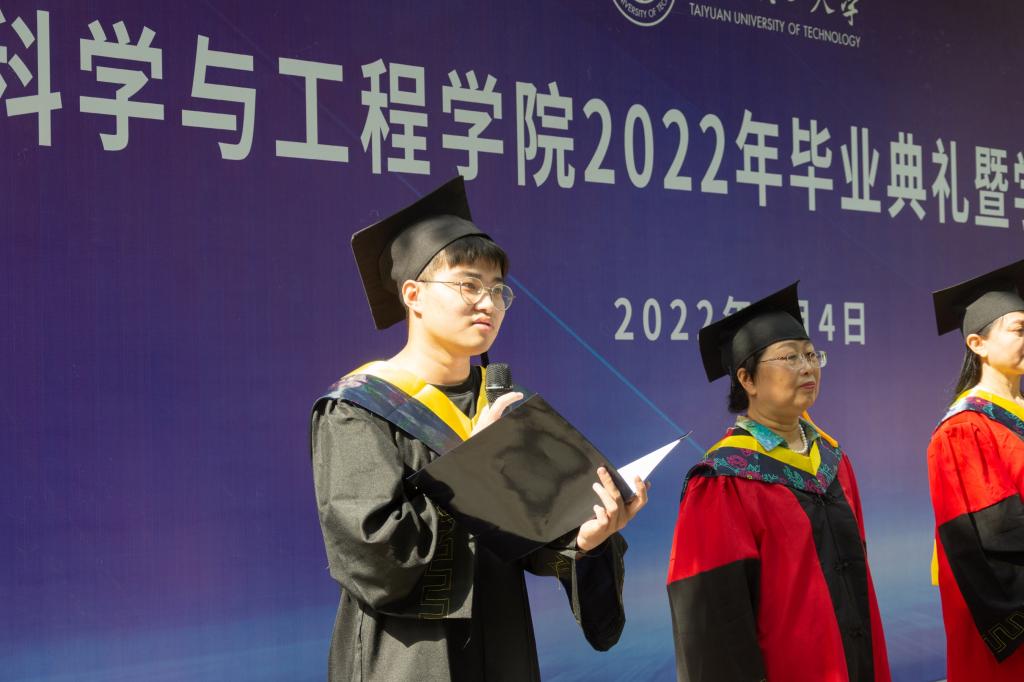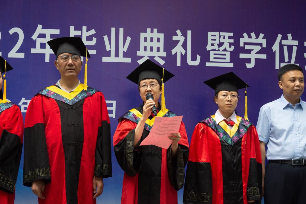 盛夏时节,草木葱茏;百廿太理,桃李芬芳。上午8时30分,院党委副书记王飞宣布仪式正式开始,全体人员同唱校歌,典礼拉开了序幕。首先,副院长肖娟向毕业生送去了临别寄语,希望他们不忘母校,谨遵老师教诲,锐意进取,再创辉煌。接下来,副院长赵雪花公布了2022届毕业学生情况,宣读了《关于授予kaiyun开云官方网站2022年普通本科毕业生学士学位的决定》和《关于授予kaiyun开云官方网站2022年研究生硕士、博士学位的决定》。她对2022届毕业生顺利毕业,取得学士学位表示祝贺。在全场的掌声下,张永波教授,赵喜萍教授、郝瑞霞教授、赵雪花教授、肖娟教授等5名老师为毕业生颁发学位证书并合影留念。学位授予仪式结束后,教师代表郭向红老师,学生代表李柏东同学依次上台发言。郭老师用激情洋溢的话语向同学们表达了毕业的祝福和离别的不舍。李柏东代表全体毕业生向辛勤培育他们的母校和各位老师表达了最衷心的感谢,表明了未来不断拼搏、不断奋斗、不断进步的决心与信念。