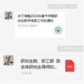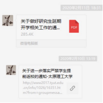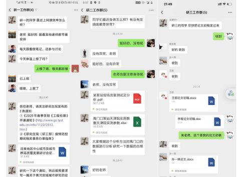 在疫情防控期间,学校和研究生院关于研究生的科研管理工作均做出重要指示,包括延期开学通知、体温日报、网络授课及研究生论文指导等。为更好配合学校工作,作为研究生教育的第一负责人,在收到重要文件通知后,第一时间在微信群中向学生发布,做到信息及时共享。