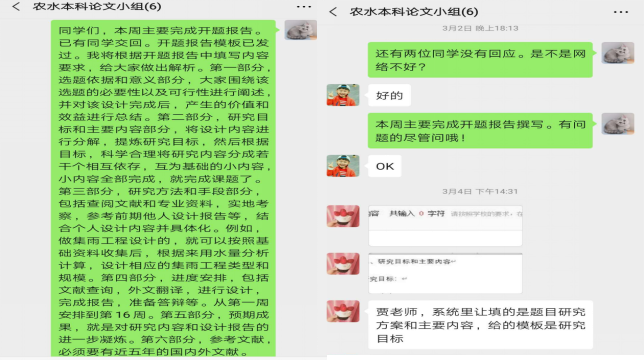 在截至目前的毕业设计环节中,做到提前布置任务,告知截止日期,过程中及时指导,营造竞争、努力、上进的网络学习氛围。沟通工具以微信群内交流为主,私信为辅,高效率,个性化引导,顺利推进工作。在沟通中,以文字形式解释和说明为主,便于学生在任务进行过程中随时翻阅和理解;交流网络资源获取的方法,授之以渔,而非授之以鱼。注重分析问题,分解任务,落脚到基础知识的能力培养,相信特殊时期的特殊沟通方式,在特定任务完成后,一定会给师生留下难得的记忆!