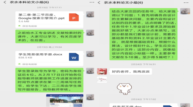 工科毕业论文(设计)是本科学习阶段的最后一个实践教学环节,是专业培养中实现人才培养目标的综合性实践教学环节,旨在提升学生从解决书本问题转向解决实际问题的能力,更是培养学生解决复杂工程问题基本素养和能力的重要环节。该环节的基本跨度为2个学期,14个教学周,包括师生互选、理解任务书、查阅资料、分析问题、设计方案、撰写报告、答辩等多个细节,细数每个环节,都离不开师生互动,面对面地沟通和交流以及个性化地指导和督促。然而,在一场突如其来的新冠肺炎疫情下,在教育部“停课不停学”精神指示下,大四学生和指导教师们选择了网络工具,如期顺利地进行着毕业设计有关工作。在学院农业水利工程专业和水文与水资源专业接受全国工程教育专业认证的背景下,如何在网络指导下保证毕业论文(设计)的质量,确保专业认证体系对毕业要求达成度的要求,需要有更多的思考,从而进行个性化方法培养,充分调动学生宅家学习的自律性和积极主动性,切实提高学生解决复杂问题的综合能力。作为学院一名青年教师,教学和工程实践经验相对欠缺,但不乏对教学工作的热爱和对学生的关心,在此与老师和同学分享疫情期间网络指导的方法,希望得到更多的批评和指正。