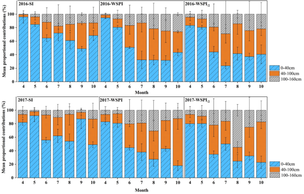图1 不同灌溉处理下各土层土壤水贡献率情况