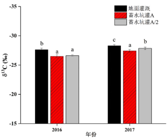 3.利用叶片碳稳定同位素并结合叶片荧光探针技术,明确基于叶片光合机理的蓄水坑灌节水增产机制,定量分析不同尺度下苹果树水分利用效率。